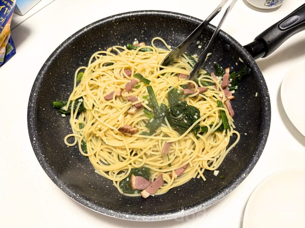 オイルのパスタが食べたかったけどベーコンがなくて、冷凍庫に眠ってた合鴨のロースが大活躍!
