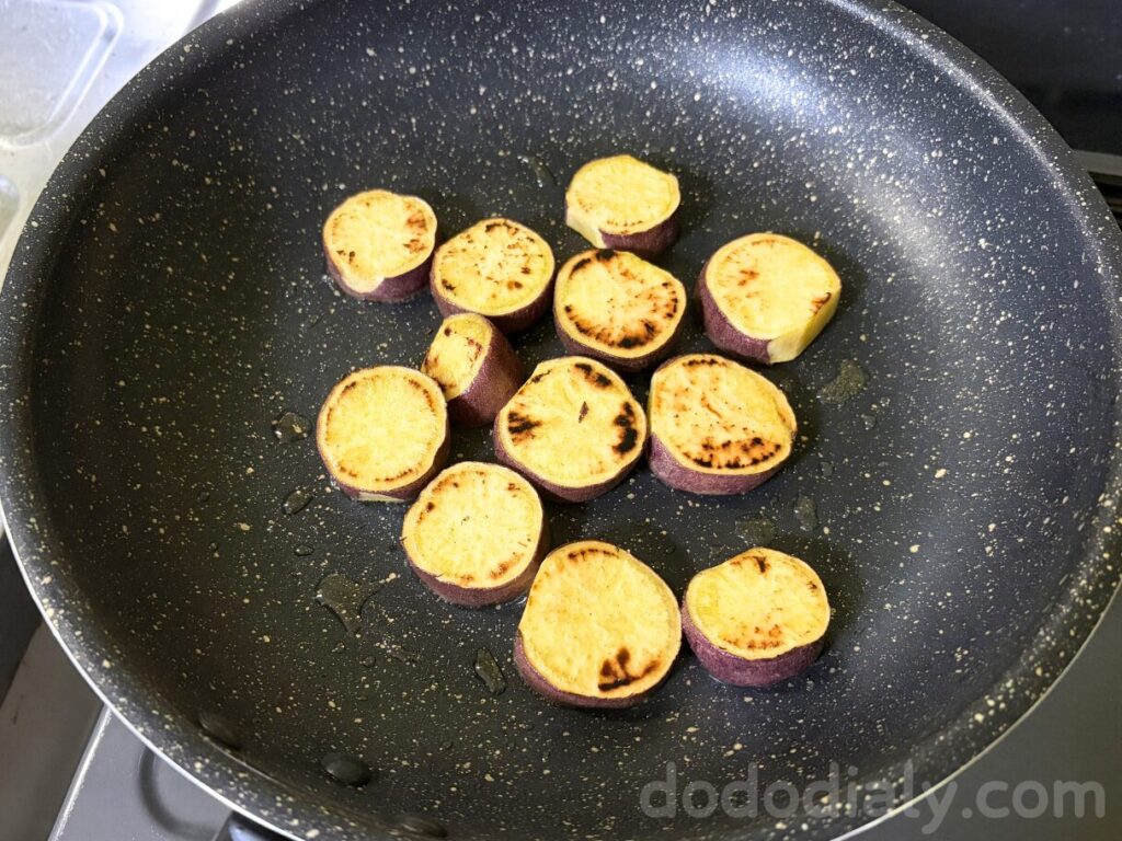 さつまいもを輪切りにして、レンチン→フライパンで焼きめをつけてバターをまぶしました。