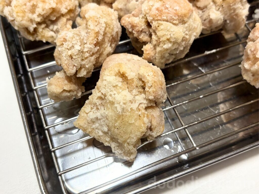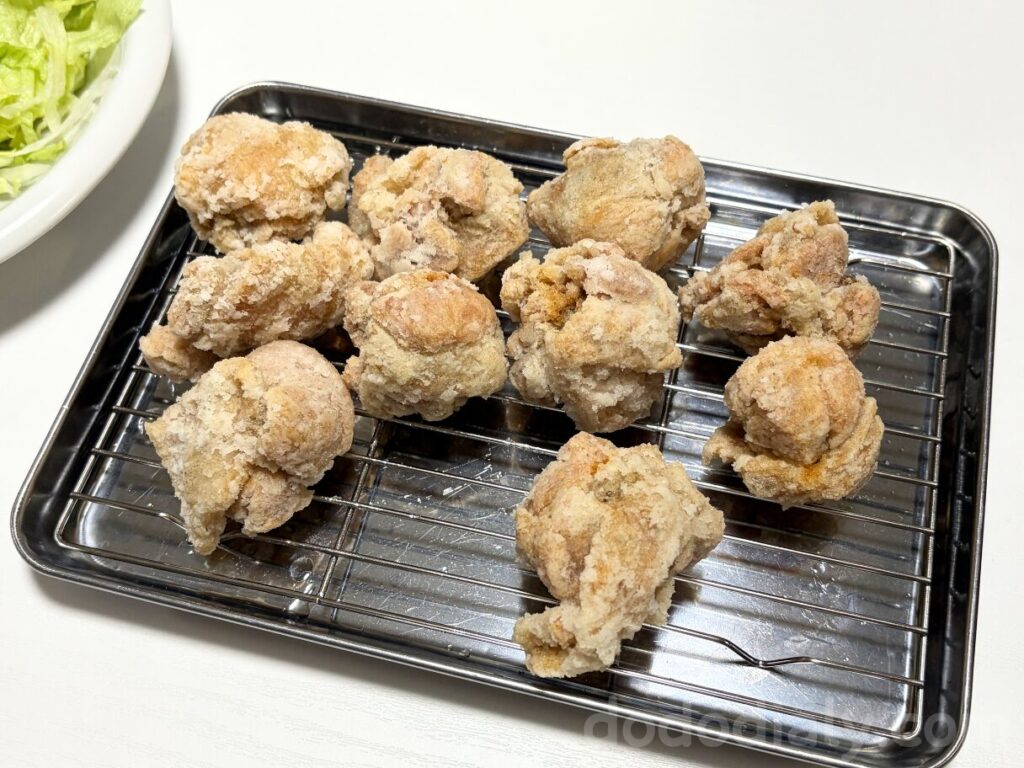 お肉に片栗粉をつけて4分半揚げると、お店の唐揚げに進化!