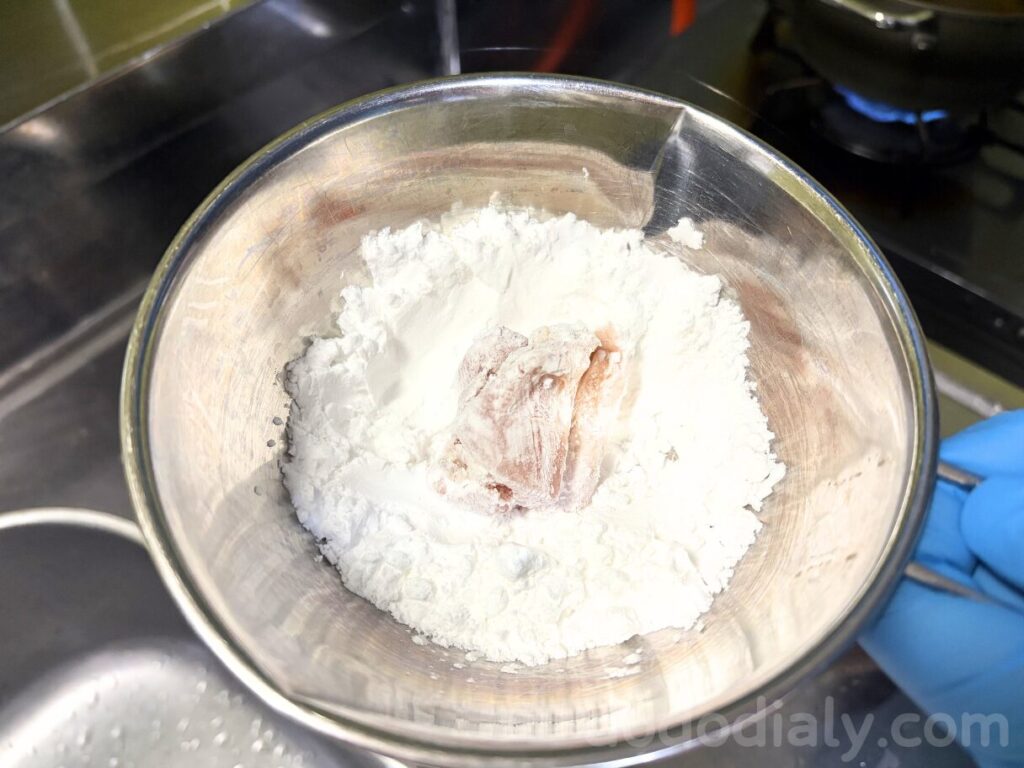 たっぷりの片栗粉をまぶします。