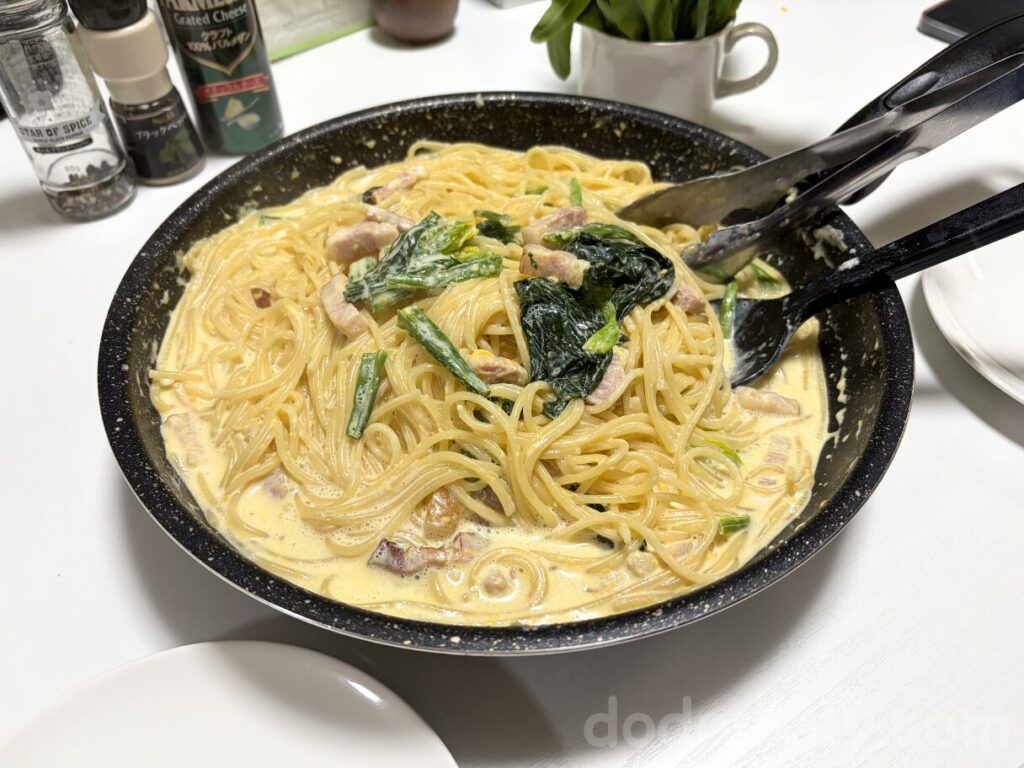 「麺を減らして、クリームを多めにして満足感を高めよう!」とか、「1回にたくさんじゃなくて、2回にわけておいしいパスタを食べよう!」とかの話も定期的に出るのです。出るのですが、食い意地が張った2人組なのでいざ食べるときは大盛りゆでちゃうんだなあ〜